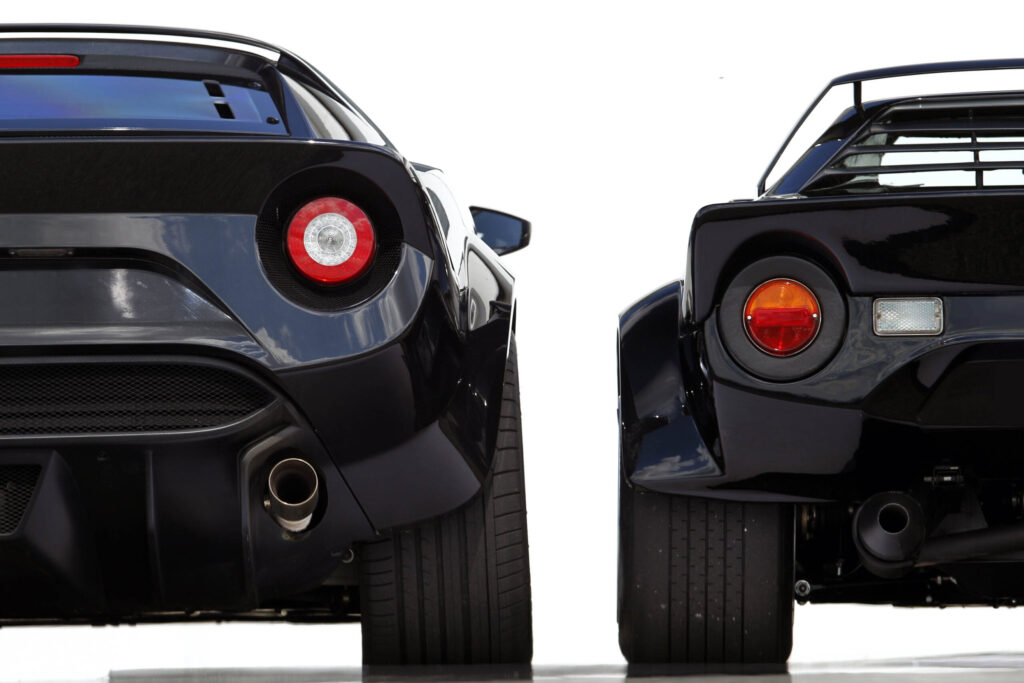 オリジナルはベルトーネ、ニューストラトスはピニンファリーナデザイン。新旧ストラトスを比較すると、さすがにニューストラトスの方がひとまわり以上大きいことに気づかされる。しかしそれでも全長4.2m程度、フェラーリV8をミドに縦置きしていることを考えると、ニューストラトスも十分にコンパクトな仕上がり。
