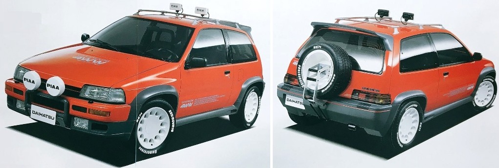 第28回東京モーターショーに出品された、3代目シャレードをベースとしたコンセプトカー。当時のシャレードにはクラス初の「センターデフ&ビスカスカップリング」を装備した本格的なフルタイム4WDモデルが設定されたばかりだった。4WW(「4 WHEEL DRIVE WILD」の意味)は、このパワートレーンを活用し、よりスポーティかつラフロード走行も視野に入れた仕様に仕立てられていた。エンジンは120馬力を発生する1.6Lに換装されてパワーアップ。オーバーフェンダーを与えられたことで、225/50VR16と外径の大きなタイヤを装着し、その名の通りワイルドな装いとなっていた。現代のクロスオーバーSUVモデルを先取りしたような、センスの光るコンセプトカーであった。