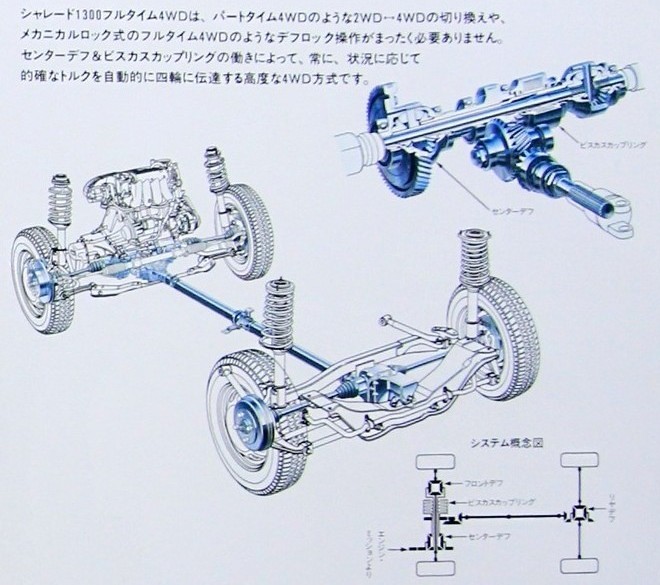 こちらが3代目シャレードに採用された4WDシステム。リッターカークラスながら、センターデフを備えた本格的なフルタイム4WDだった。