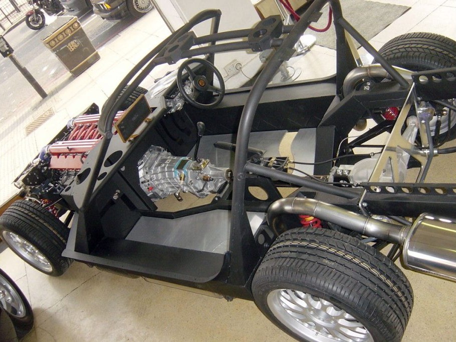 こちらはボディを架装される前のファイターのシャシー。ボックスフレームとロールケージの組み合わせであることがわかる。ちなみにバイパー用の8.0L V10をチューニングしたエンジンには、6速マニュアルのほか、4速オートマチックを組み合わせることができた。
