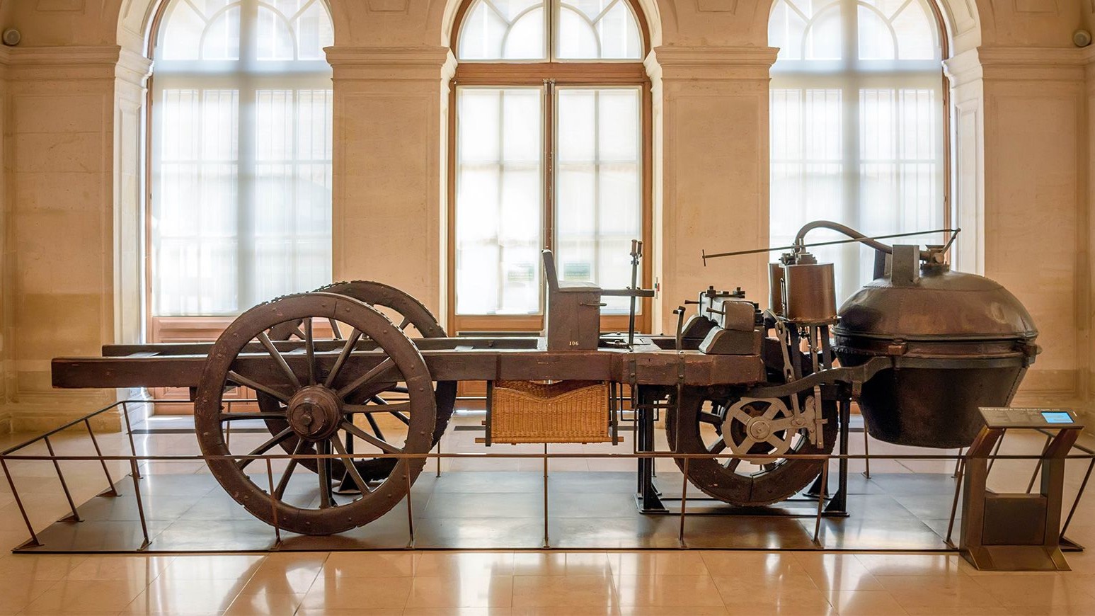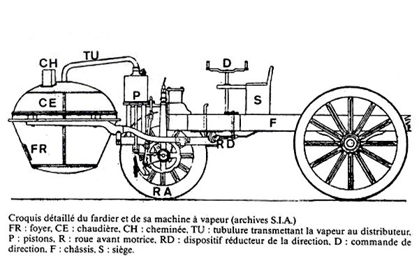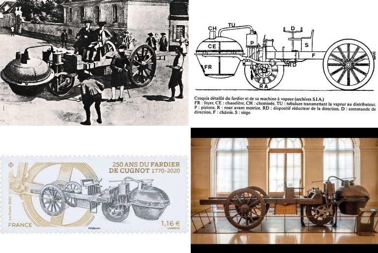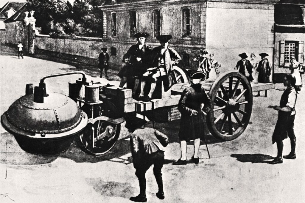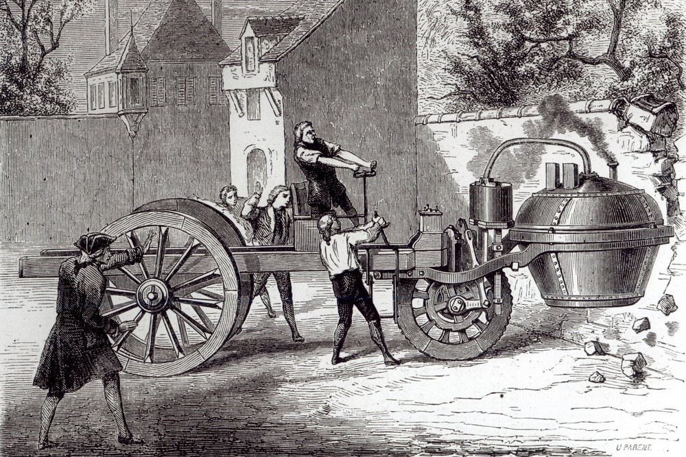 1712年、イギリスのトマス・ニューコメンが、炭鉱の揚水用として実用的な蒸気機関を初めて用いた。イギリスではこれ以降、次々と蒸気機関が稼働していくが、この原動機を大砲移動用車両に活用しようとしたのがフランスの軍事技術者、ニコラ=ジョセフ・キュニョーであった。彼はフランス軍とルイ15世の財政的援助を得て、砲車の開発に着手。1769年には当初計画の1/2サイズの1号車での運転に成功したため、より大きなサイズの2号車の製作へと進んだ。翌70年にはこれが完成。この車両は前端にボイラー、その後ろに2つのピストンを持つ蒸気機関を備え、ピストンの往復運動はラチェット機構により回転運動へと変換されて前輪を駆動する3輪自動車であった。これは4人を乗せて5~7km/hで走行可能だったといわれるが、連続走行が15分までしかできず、その後の再走行まではさらに15分を要するという欠点があった。キュニョーの砲車は将来有望な移動手段と考えられていたが、軍部の人事交代でキュニョーの支持者が離れてしまったことなどもあり、これ以上の開発を続けることができなかった。なお、砲車の2号車については今も現存しており、パリ工芸博物館で展示されている。