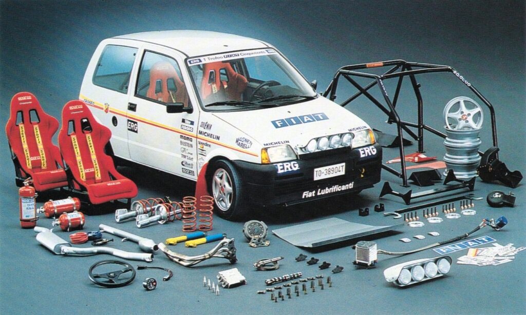 パワーユニットは、初期のワンメイクシリーズでは903ccの直列4気筒OHVユニットが採用され、最高出力は標準の39馬力から「55馬力/6,500rpm」へと引き上げられた。のちに「スポルティング」がベースになると、エンジンは1.1L直列4気筒の「FIRE」ユニットへと刷新。こちらは標準の55馬力をベースに、専用の排気システムや吸気系の調整を施すことで、競技仕様では概ね「60〜65馬力」程度を発生した。わずかな数値に見えるが、700kg台の超軽量ボディとクロスレシオ化されたトランスミッションの組み合わせは、数字以上の俊敏な加速をもたらした。